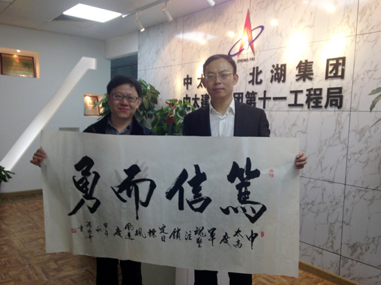 11月3日-4日,原全國人大常委會新聞局局長、現任中國詩詞文化國際交流協會會長傅強年、國家著名導演趙京輝及北京淳元信德文化傳播有限公司負責人汪曉蘭、吳凌一行四人組成的考察組蒞臨中太建設集團第十一工程局上海總部,洽談有關“中太夢-援藏文化行”合作事宜。十一局副局長陳可偉攜相關工作人員親切接待了考察組,并召開座談會,就文化援藏工作的相關細節進行商討,雙方表示要積極響應習近平主席在近期文藝工作座談會上的重要指示,將社會效益和經濟效益完美結合,辦好辦實文化援藏工作。