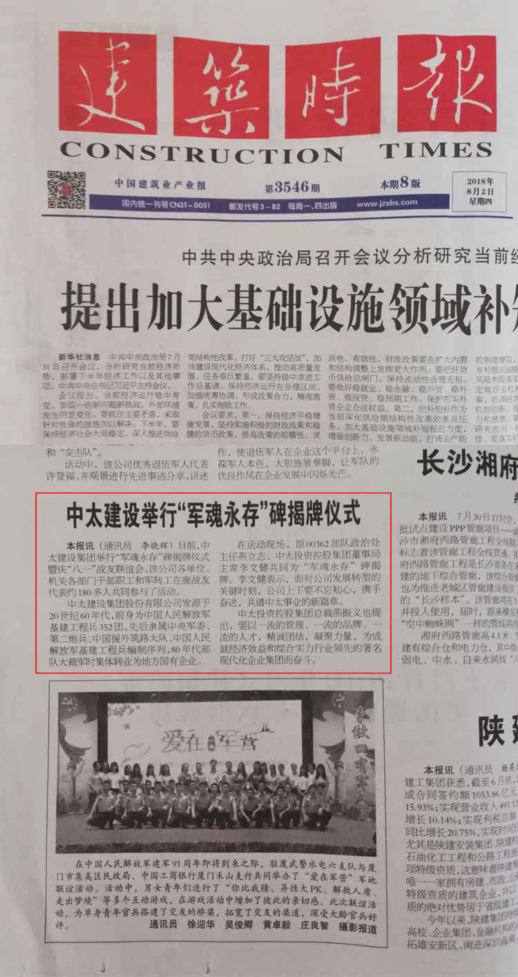 建筑時報8月2日報道了“中太建設集團“軍魂永存”碑揭牌儀式”