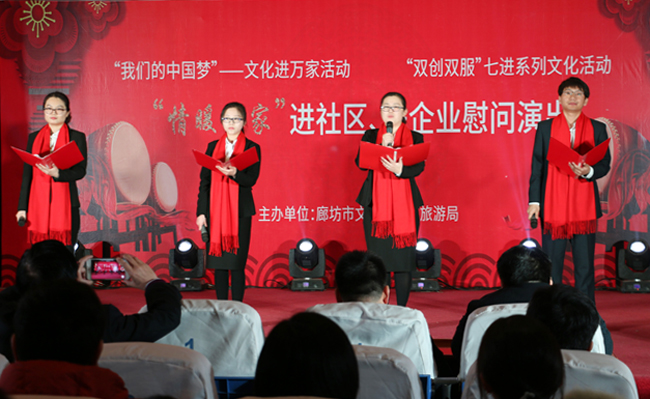 2019年2月19日上午,廊坊市伴著瑞雪迎春的兆頭和上元節(jié)張燈結(jié)彩的情景。中太大廈二樓多功能廳燈光璀璨,歡聲笑語,廊坊市文化廣電和旅游局組織的“我們的中國夢”文化進萬家系列活動在此舉辦,這也是這支文藝小分隊進企業(yè)、進社區(qū)開展“情暖萬家”慰問演出的第十場演出。市文廣旅局副局長李永生、中太投資控股集團監(jiān)事會主席吉士俊出席活動并分別致辭,中太系統(tǒng)在廊各板塊的部分員工觀看了慰問演出。