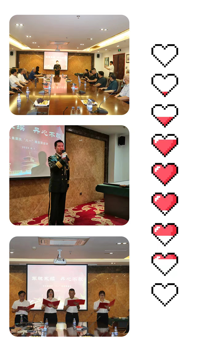 2023年8月1日,中太集團(tuán)舉辦了慶祝中國(guó)人民解放軍建軍96周年戰(zhàn)友聯(lián)誼活動(dòng)。展示軍人精神面貌,增進(jìn)戰(zhàn)友深厚情誼,傳承部隊(duì)光榮傳統(tǒng),進(jìn)一步弘揚(yáng)中太優(yōu)良文化,營(yíng)造積極向上的良好氛圍。活動(dòng)由一段詩(shī)歌朗誦《戰(zhàn)友是什么》拉開序幕;退伍軍人獨(dú)唱了軍旅歌曲《軍人本色》、《再見大別山》和《兒行千里》;老戰(zhàn)友現(xiàn)場(chǎng)揮灑筆墨“軍魂永續(xù)、丹心不改”;活動(dòng)中老首長(zhǎng)踴躍發(fā)言,講了建軍節(jié)的意義,部隊(duì)軍轉(zhuǎn)工的發(fā)展歷程;中太投資控股集團(tuán)董事局主席李文健作了《軍魂永續(xù) 丹心不改》的重要講話。