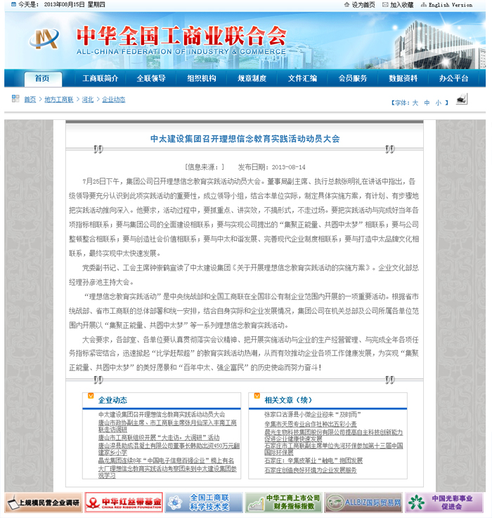 全國工商聯(lián)網(wǎng)站8月14日報道了中太建設(shè)集團召開理想信念教育實踐活動動員大會